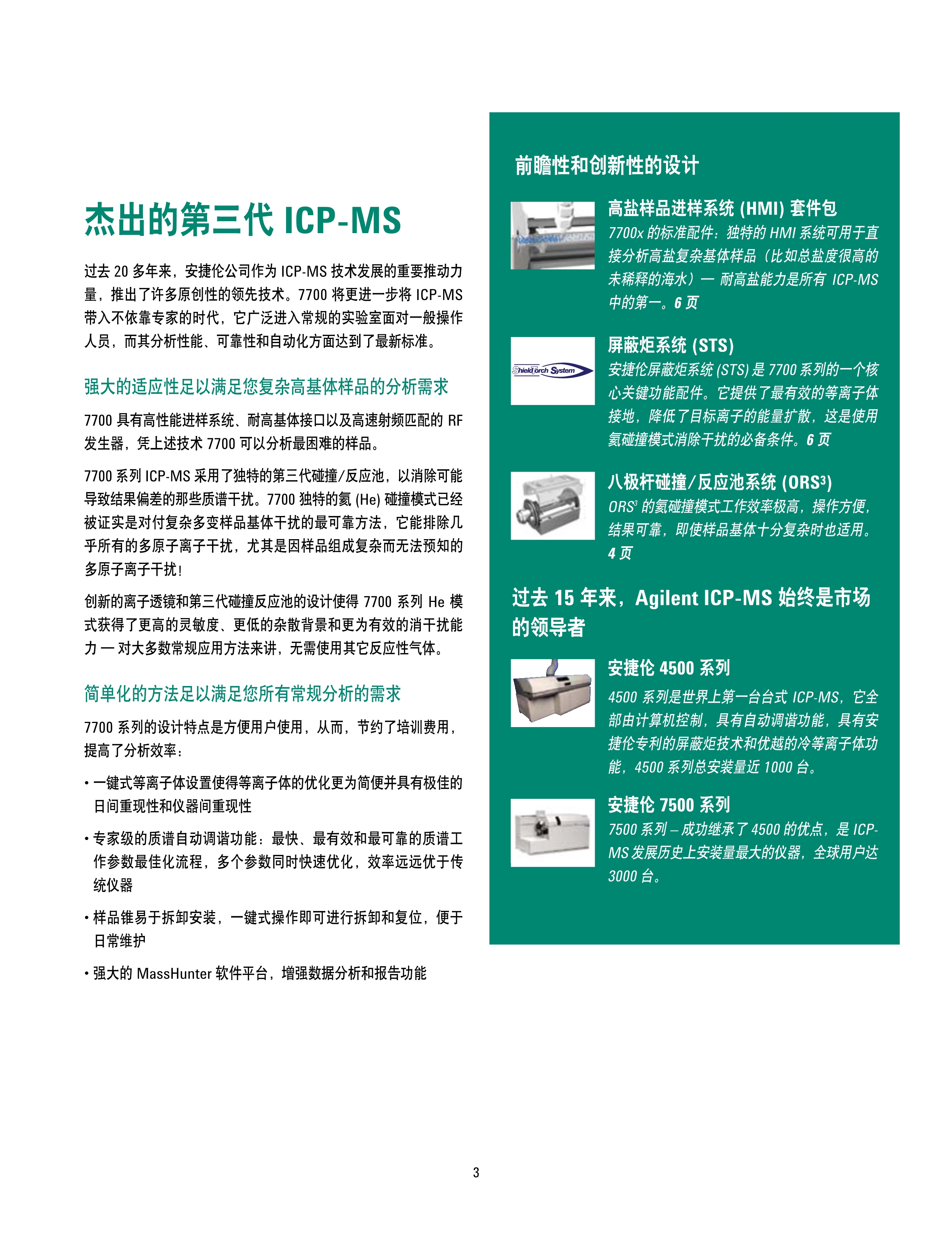 简述: 无论您是想以最快的速度分析成百上千个基体复杂的样品,还是想要获得高纯试剂中超痕量杂质的最可信结果,安捷伦 7700 系列 ICP-MS 都能助您满足当前以及未来的分析需求。 安捷伦 7700 系列 ICP-MS – ICP-MS 仪器的新面孔 – 是世界上最小的商品化 ICP-MS。作为最畅销的安捷伦 7500 系列 ICP-MS 的继承者,7700 性能在各方面更胜一筹:分析速度更快、操作更简便、灵敏度更高、背景噪音更低、消干扰效果更 佳、应用面更广、维护更方便。