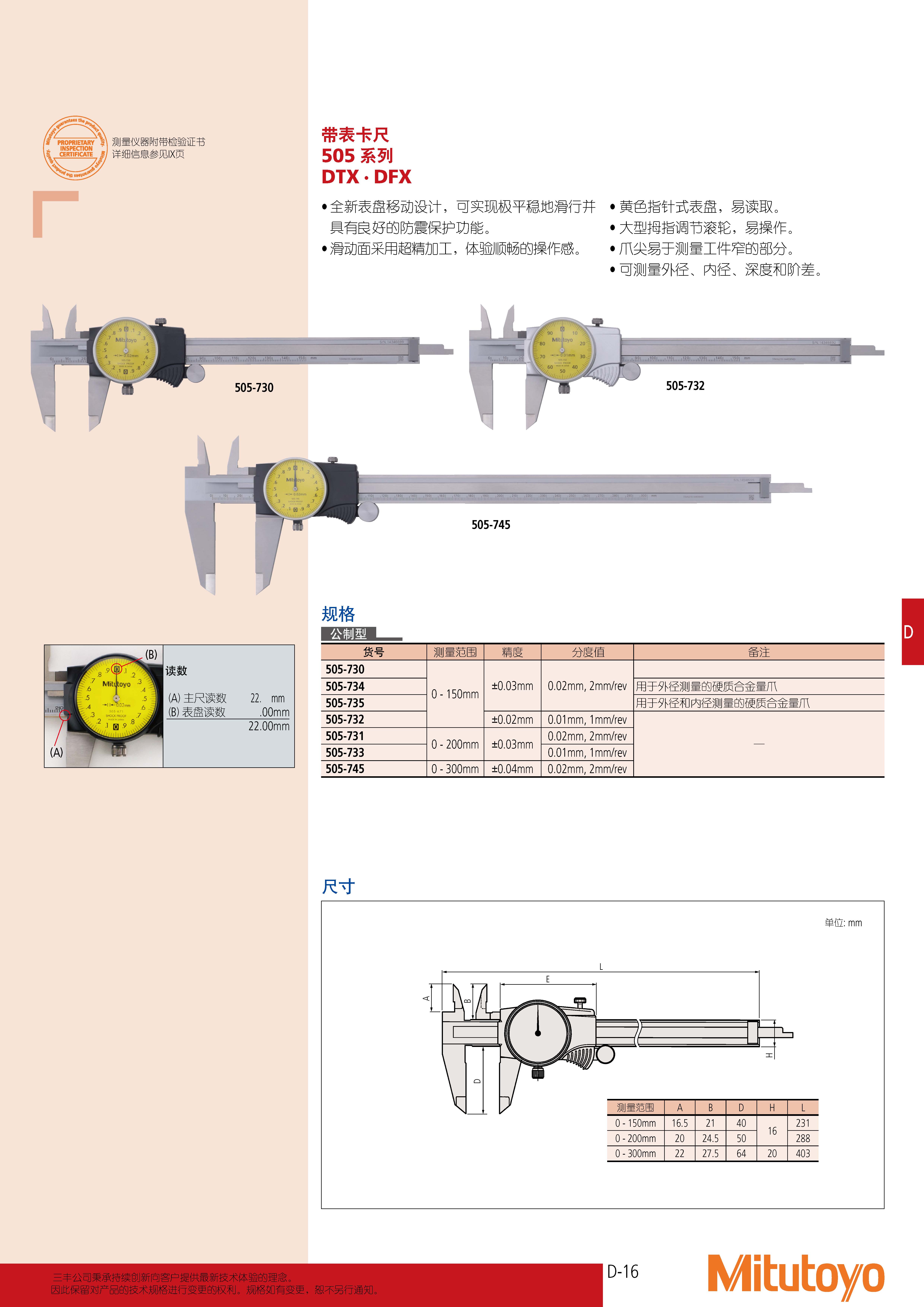 简述: 带表卡尺 505 系列 DTX · DFX • 全新表盘移动设计,可实现极平稳地滑行并 具有良好的防震保护功能。 • 滑动面采用超精加工,体验顺畅的操作感。 • 黄色指针式表盘,易读取。 • 大型拇指调节滚轮,易操作。 • 爪尖易于测量工件窄的部分。 • 可测量外径、内径、深度和阶差。