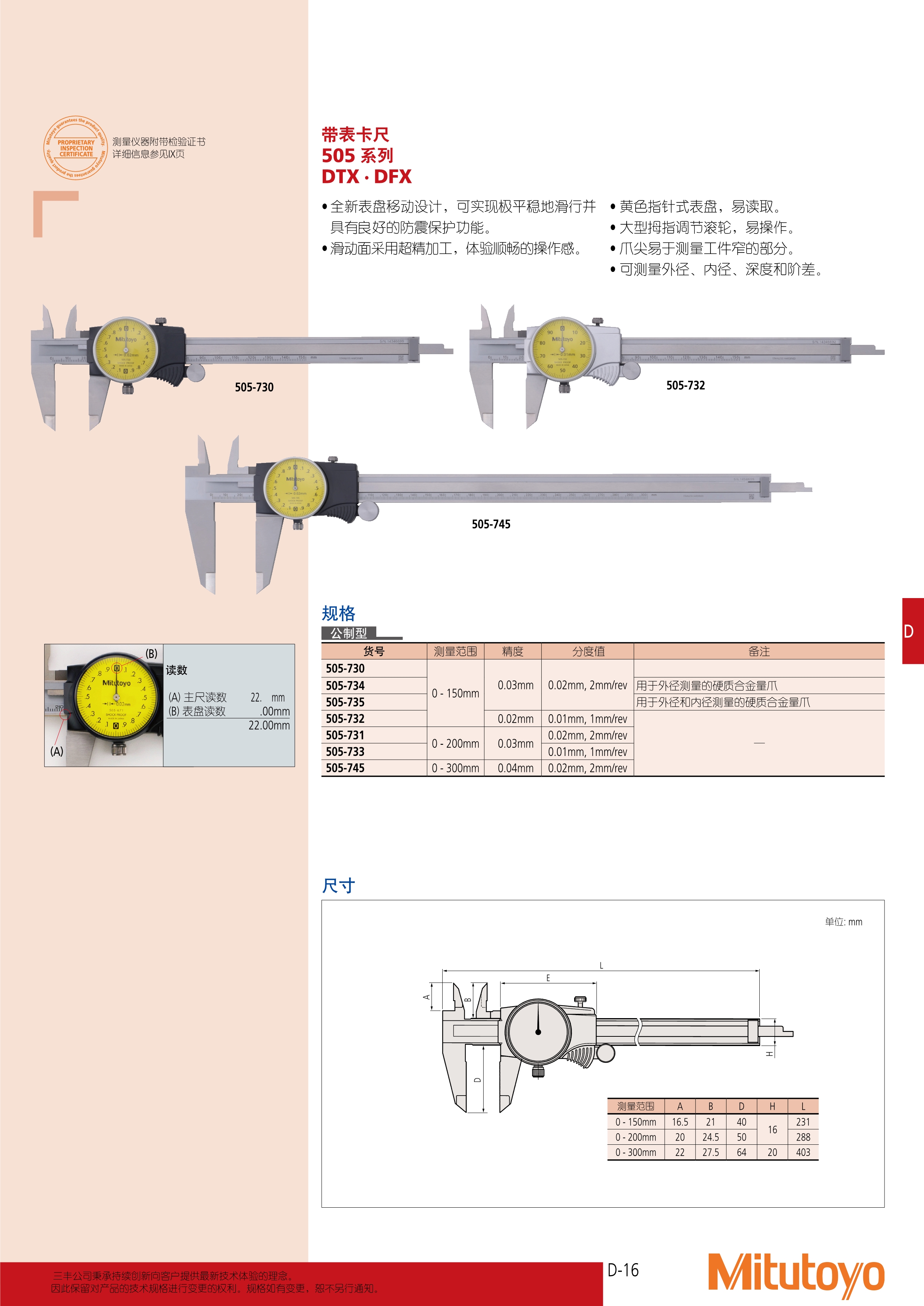 简述: 带表卡尺 505 系列 DTX · DFX • 全新表盘移动设计,可实现极平稳地滑行并 具有良好的防震保护功能。 • 滑动面采用超精加工,体验顺畅的操作感 • 黄色指针式表盘,易读取。 • 大型拇指调节滚轮,易操作。 • 爪尖易于测量工件窄的部分。 • 可测量外径、内径、深度和阶差