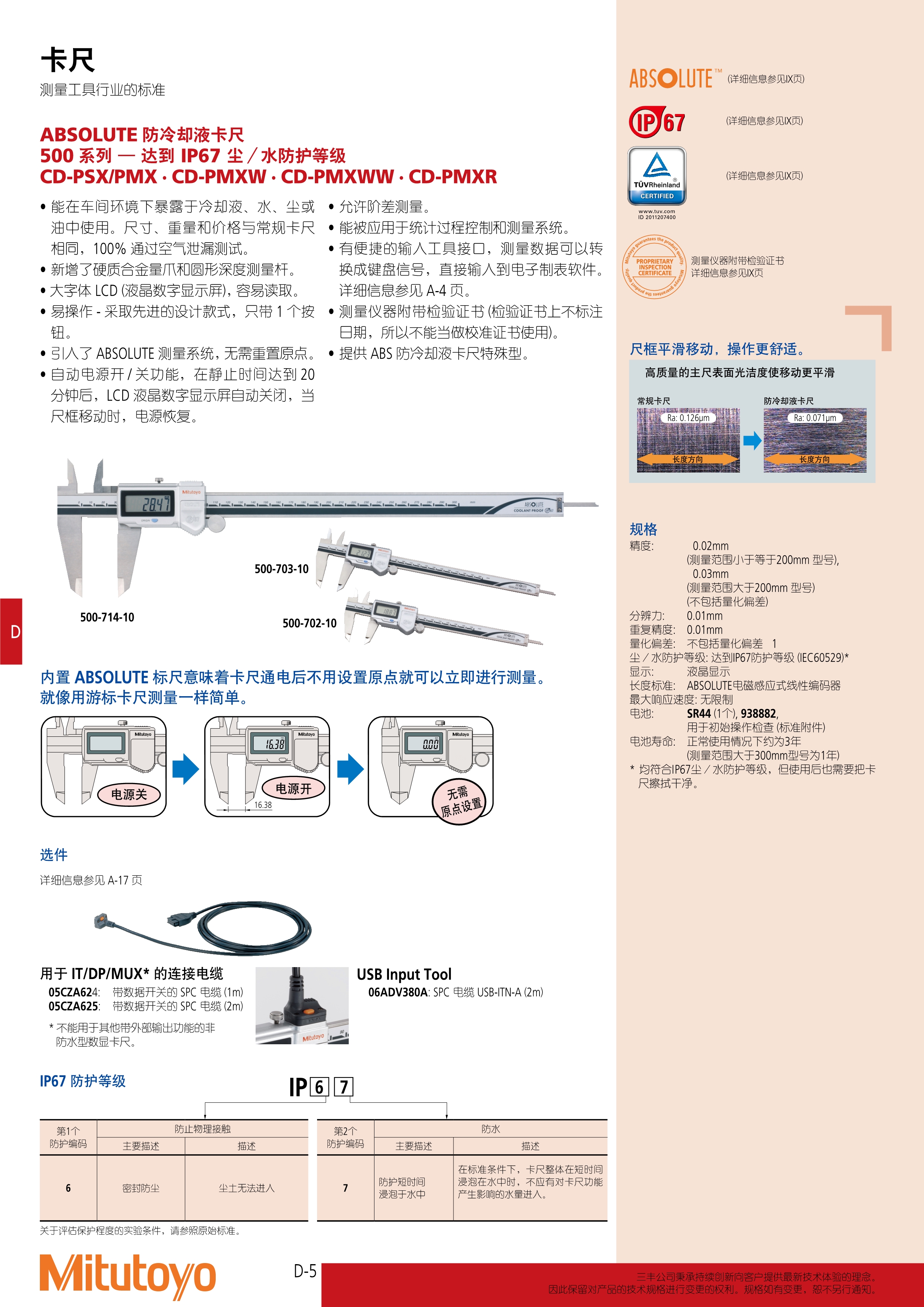 简述: ABSOLUTE 防冷却液卡尺 500 系列 — 达到 IP67 尘/水防护等级 CD-PSX/PMX · CD-PMXW · CD-PMXWW · CD-PMXR • 能在车间环境下暴露于冷却液、水、尘或 油中使用。尺寸、重量和价格与常规卡尺 相同,100% 通过空气泄漏测试。 • 新增了硬质合金量爪和圆形深度测量杆。 • 大字体 LCD (液晶数字显示屏),容易读取。 • 易操作 - 采取先进的设计款式,只带 1 个按 钮。
