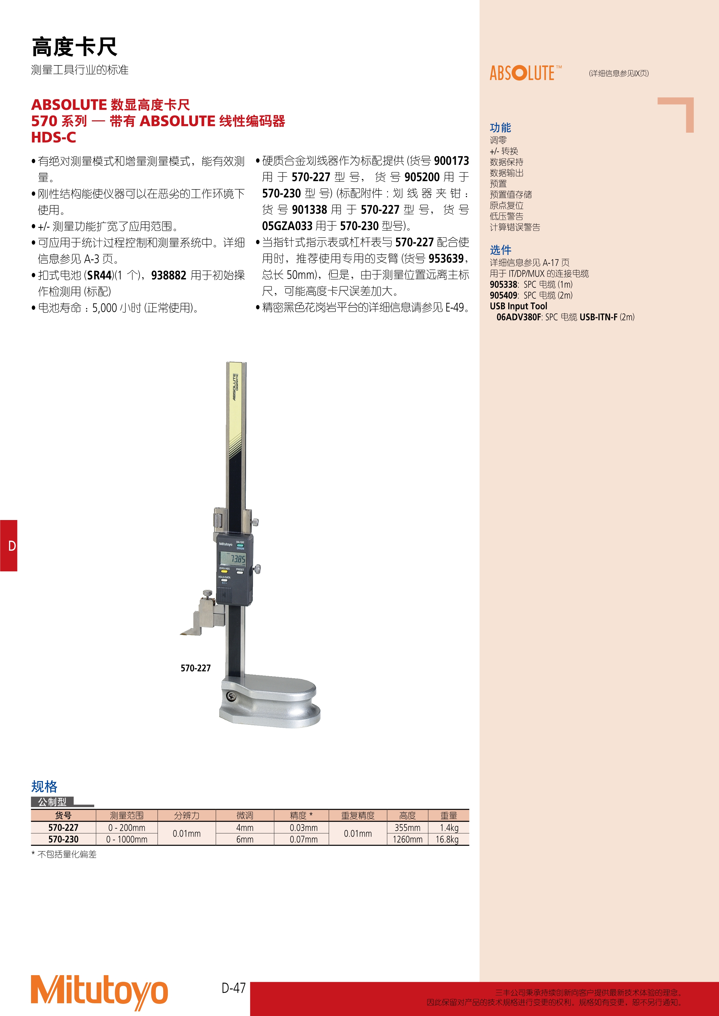 简述: ABSOLUTE 数显高度卡尺 570 系列 — 带有 ABSOLUTE 线性编码器 HDS-C • 有绝对测量模式和增量测量模式,能有效测 量。 • 刚性结构能使仪器可以在恶劣的工作环境下 使用。 • +/- 测量功能扩宽了应用范围。 • 可应用于统计过程控制和测量系统中。详细 信息参见 A-3 页。 • 扣式电池 (SR44)(1 个),938882 用于初始操 作检测用 (标配) • 电池寿命 :5,000 小时 (正常使用)。