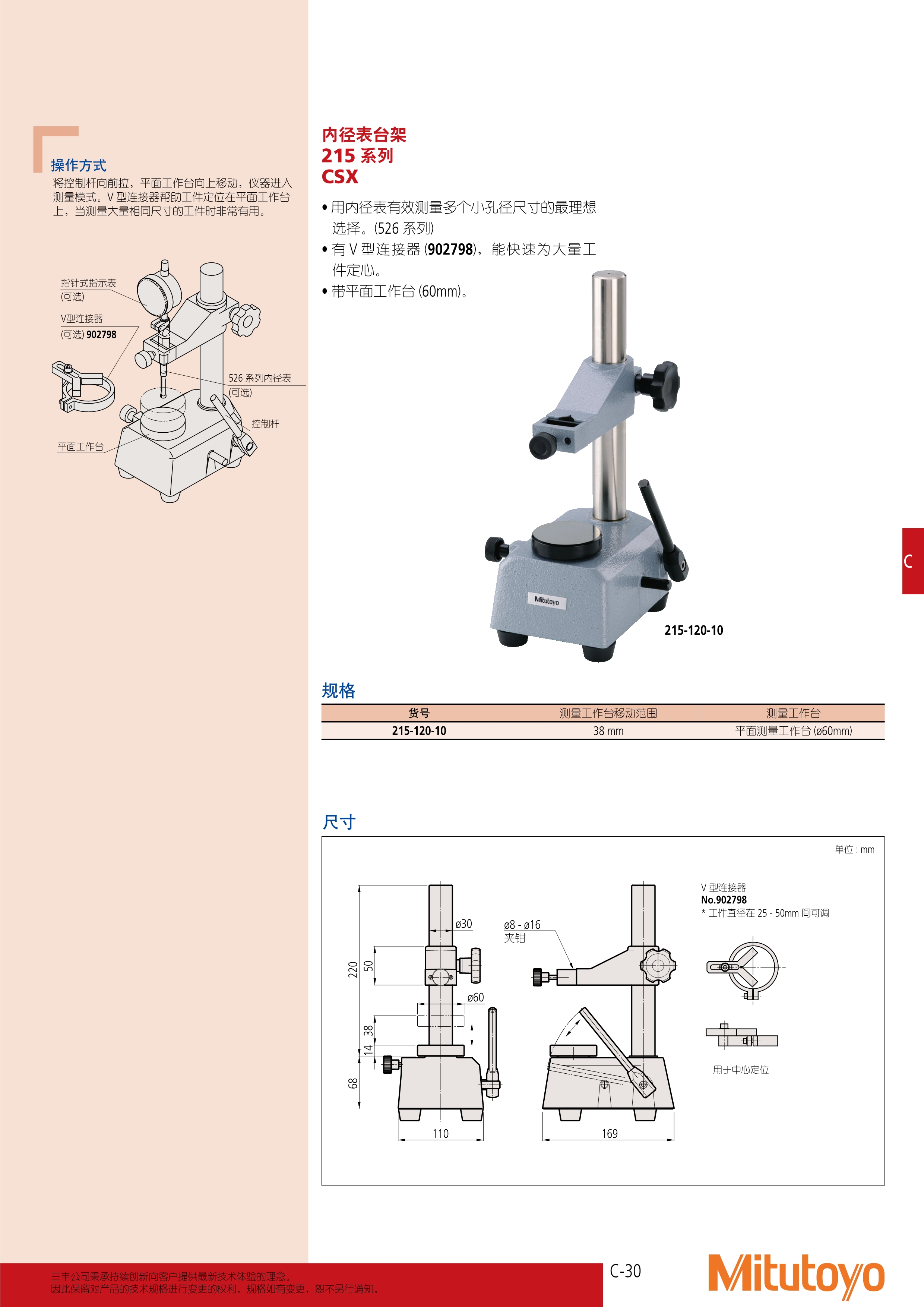 简述: 内径表台架 215 系列 CSX • 用内径表有效测量多个小孔径尺寸的最理想 选择。(526 系列) • 有 V 型连接器 (902798),能快速为大量工 件定心。 • 带平面工作台 (60mm)。