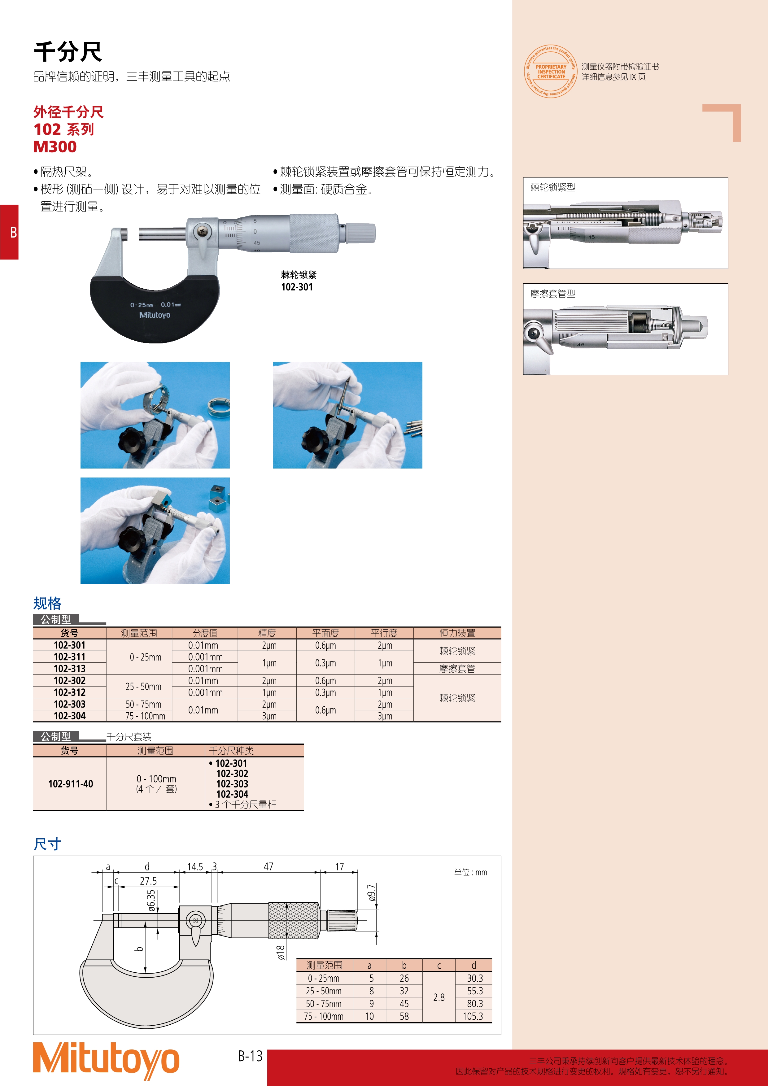 简述: 外径千分尺 102 系列 M300 • 隔热尺架。 • 楔形 (测砧一侧) 设计,易于对难以测量的位 置进行测量。 • 棘轮锁紧装置或摩擦套管可保持恒定测力。 • 测量面: 硬质合金。