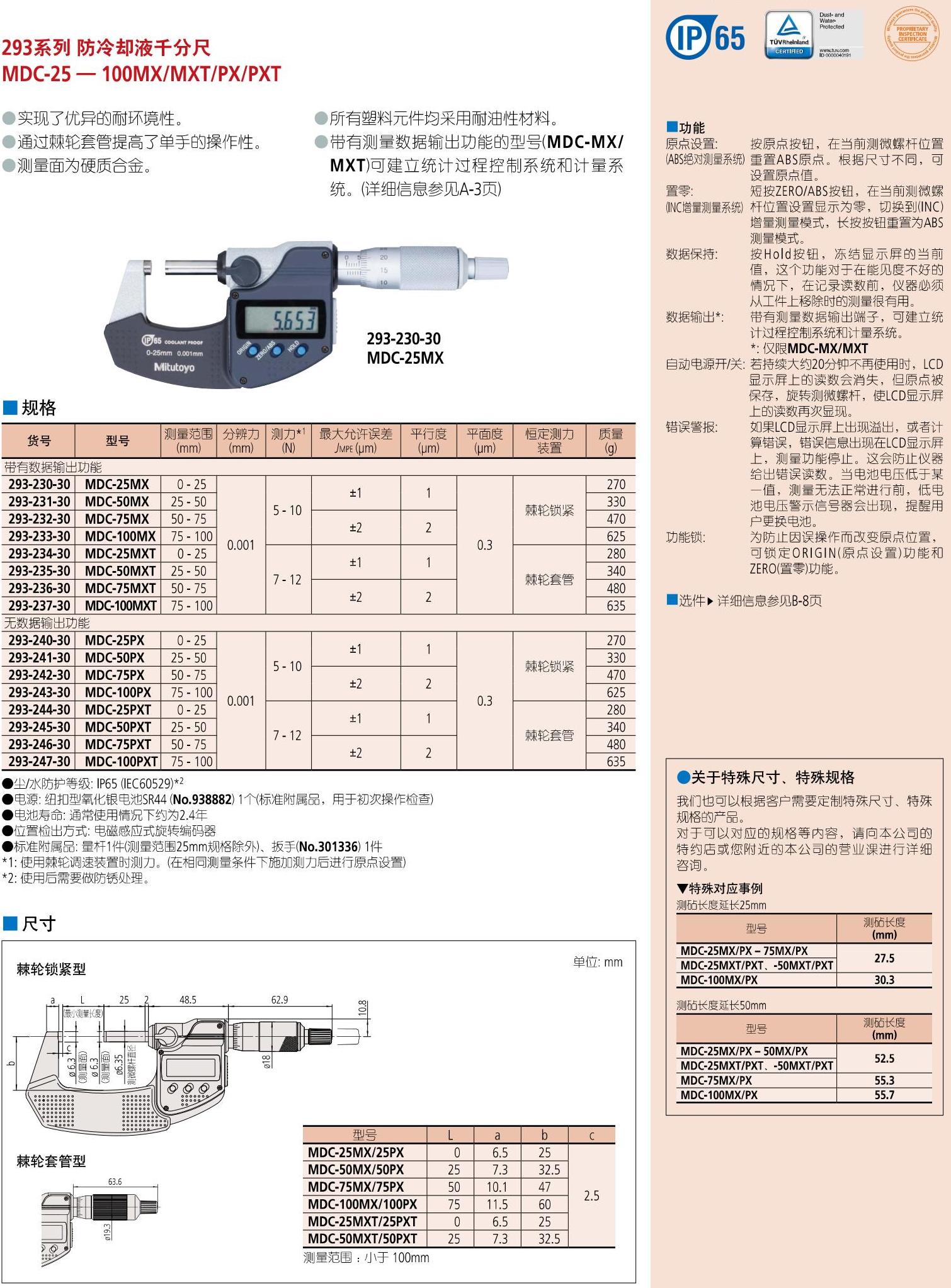 简述: 防冷却液千分尺 293 系列 MDC-MX/MXT/PX/PXT/MJB 高性能达到世界最高水平。 • 电池寿命达到约 2.4 年,可减少繁琐的电池 更换。 • 隔热装置、表面护板部分,考虑到便于手持 测量,采用 了防滑形状 (凸起形状)