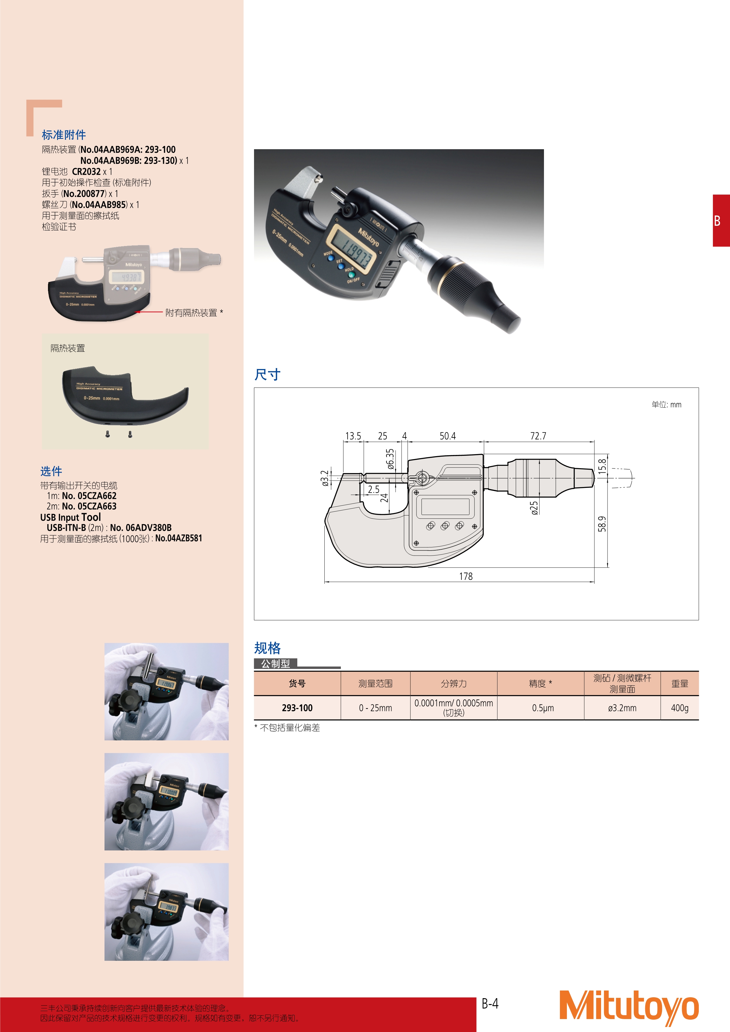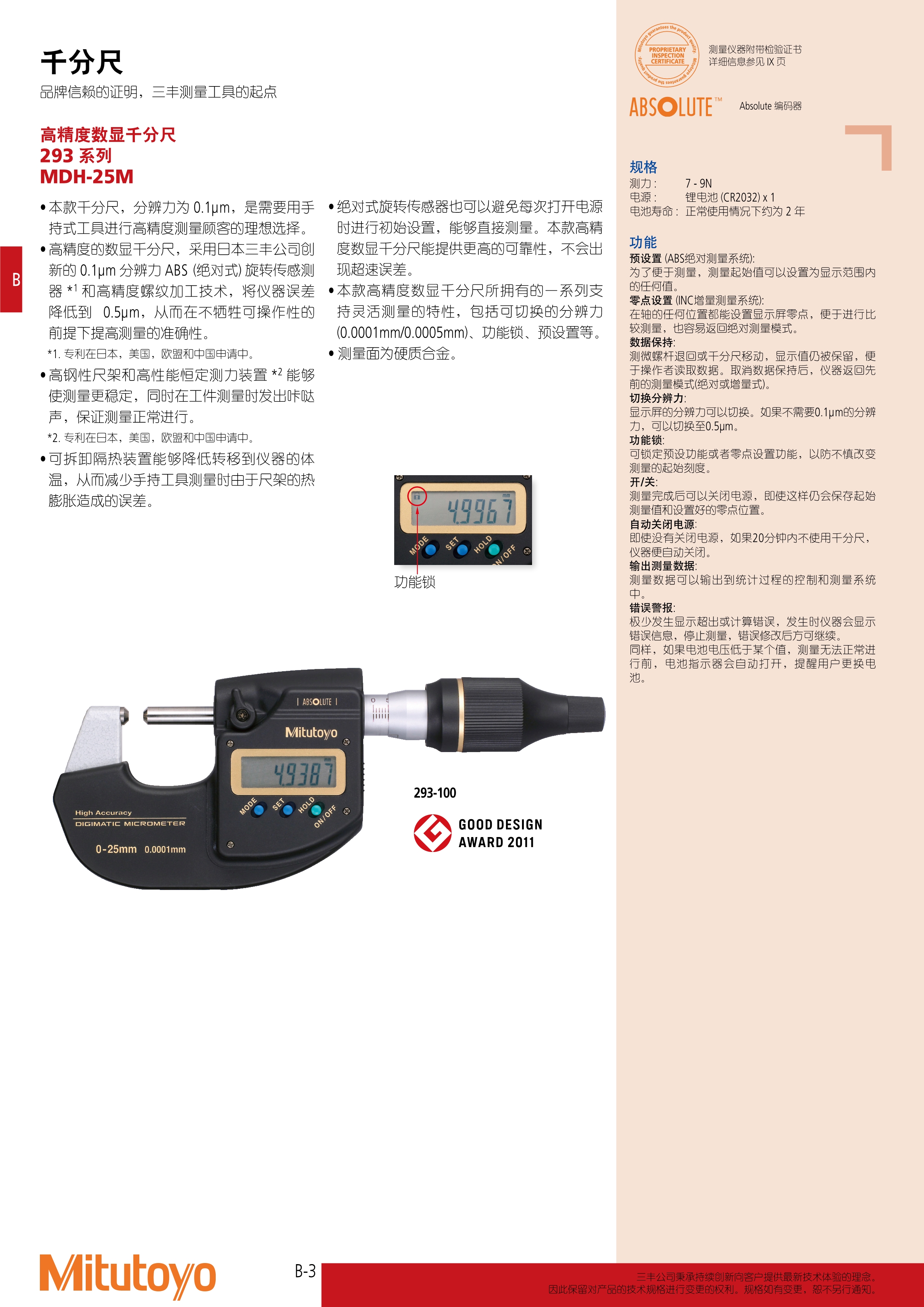 简述: 高精度数显千分尺 293 系列 MDH-25M • 本款千分尺,分辨力为 0.1µm,是需要用手 持式工具进行高精度测量顾客的理想选择。 • 高精度的数显千分尺,采用日本三丰公司创 新的 0.1µm 分辨力 ABS (绝对式) 旋转传感测 器 *1 和高精度螺纹加工技术,将仪器误差 降低到 ±0.5µm,从而在不牺牲可操作性的 前提下提高测量的准确性。