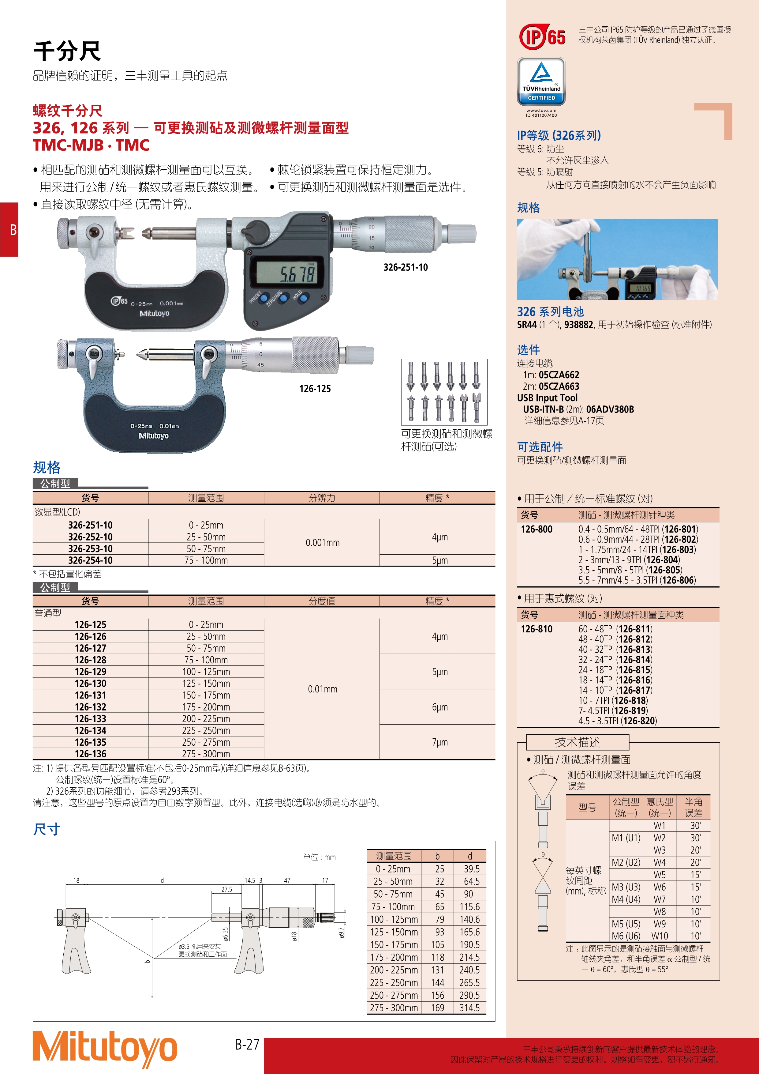 简述: 螺纹千分尺 326, 126 系列 — 可更换测砧及测微螺杆测量面型 TMC-MJB · TMC • 相匹配的测砧和测微螺杆测量面可以互换。 用来进行公制/统一螺纹或者惠氏螺纹测量。 • 直接读取螺纹中径 (无需计算)。 棘轮锁紧装置可保持恒定测力。 • 可更换测砧和测微螺杆测量面是选件