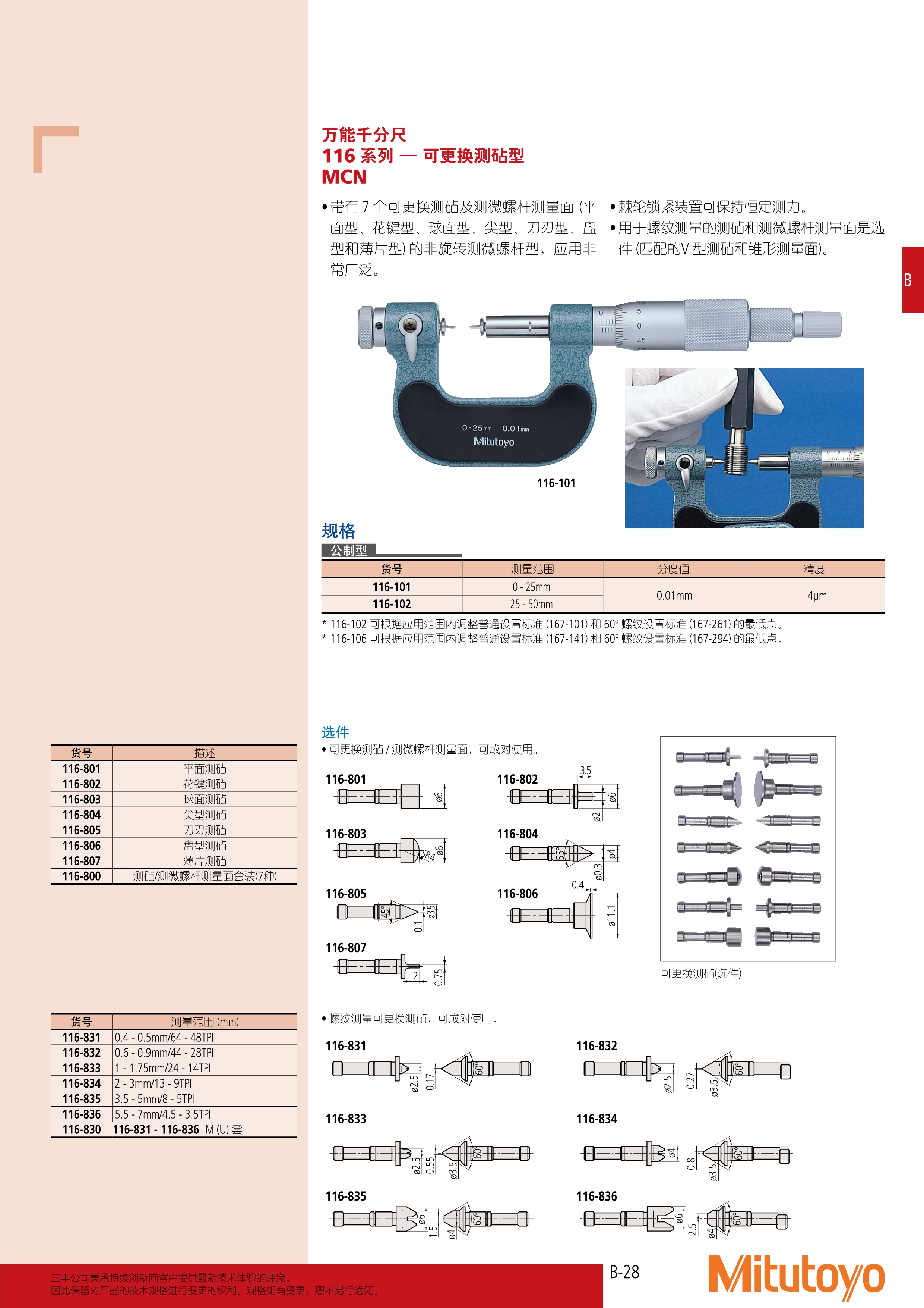 简述: 万能千分尺 116 系列 — 可更换测砧型 MCN • 带有 7 个可更换测砧及测微螺杆测量面 (平 面型、花键型、球面型、尖型、刀刃型、盘 型和薄片型) 的非旋转测微螺杆型,应用非 常广泛。 • 棘轮锁紧装置可保持恒定测力。 • 用于螺纹测量的测砧和测微螺杆测量面是选 件 (匹配的V 型测砧和锥形测量面