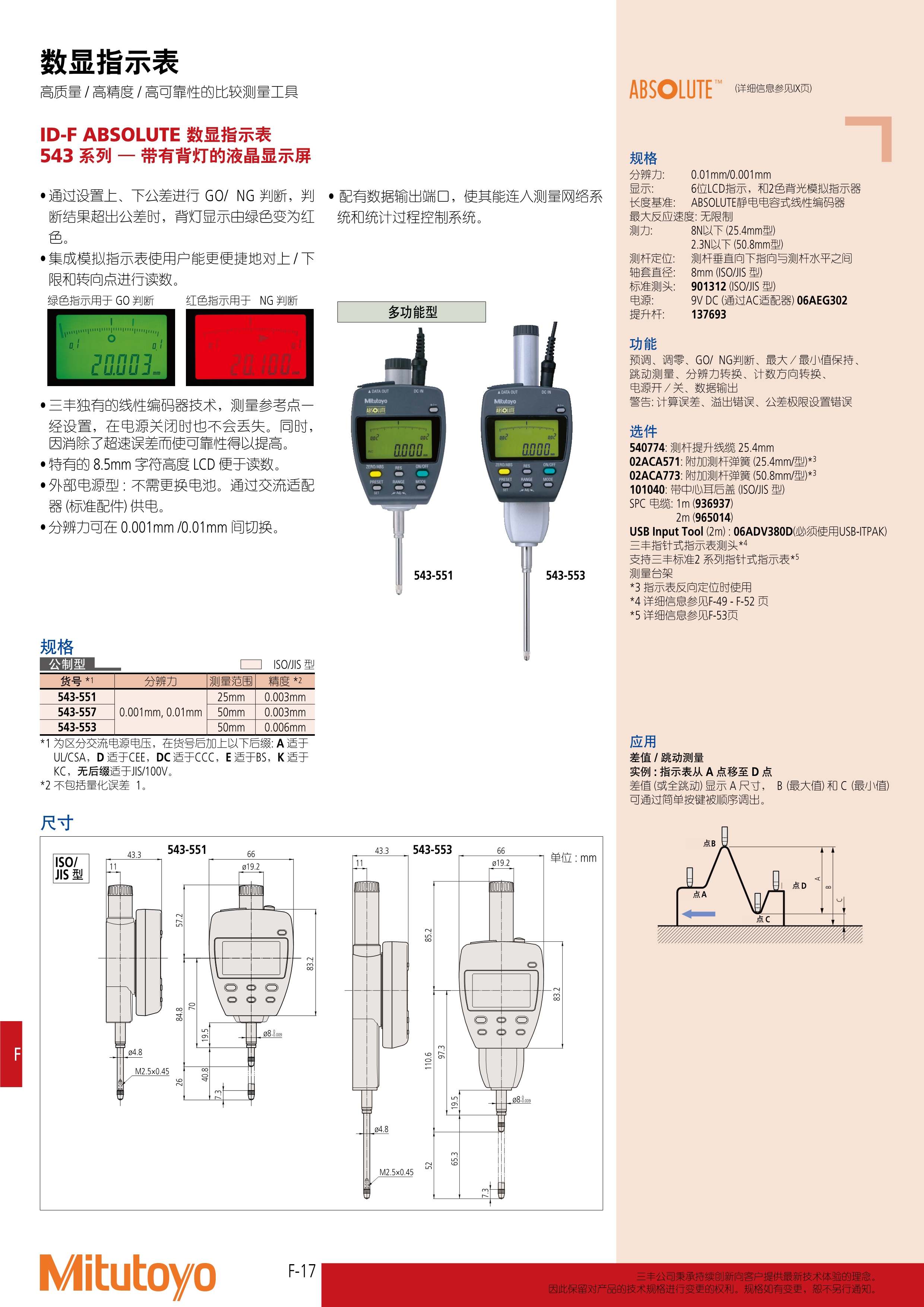 简述: ID-F ABSOLUTE 数显指示表 543 系列 — 带有背灯的液晶显示屏 • 通过设置上、下公差进行 GO/±NG 判断,判 断结果超出公差时,背灯显示由绿色变为红 色。 • 集成模拟指示表使用户能更便捷地对上 / 下 限和转向点进行读数。