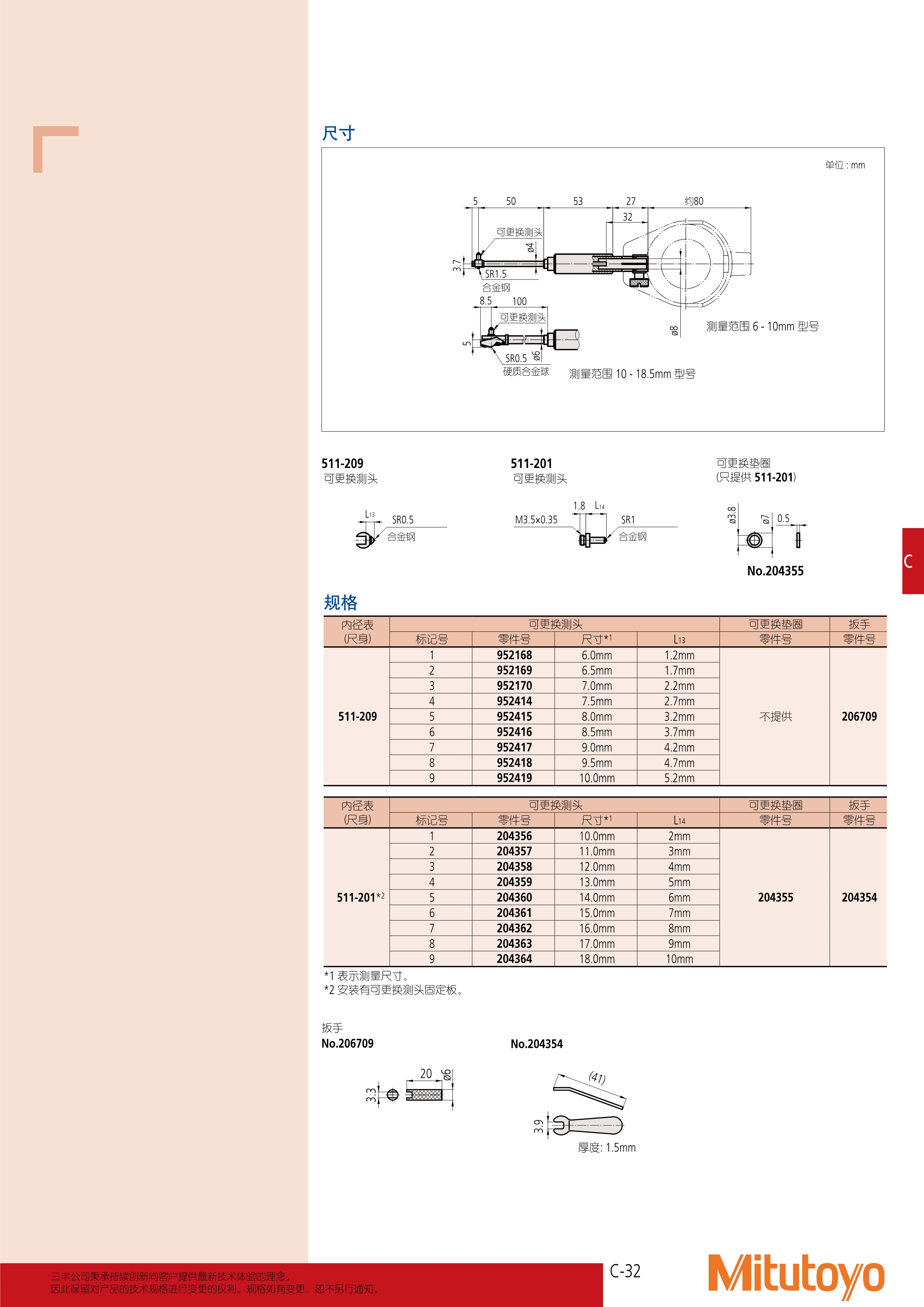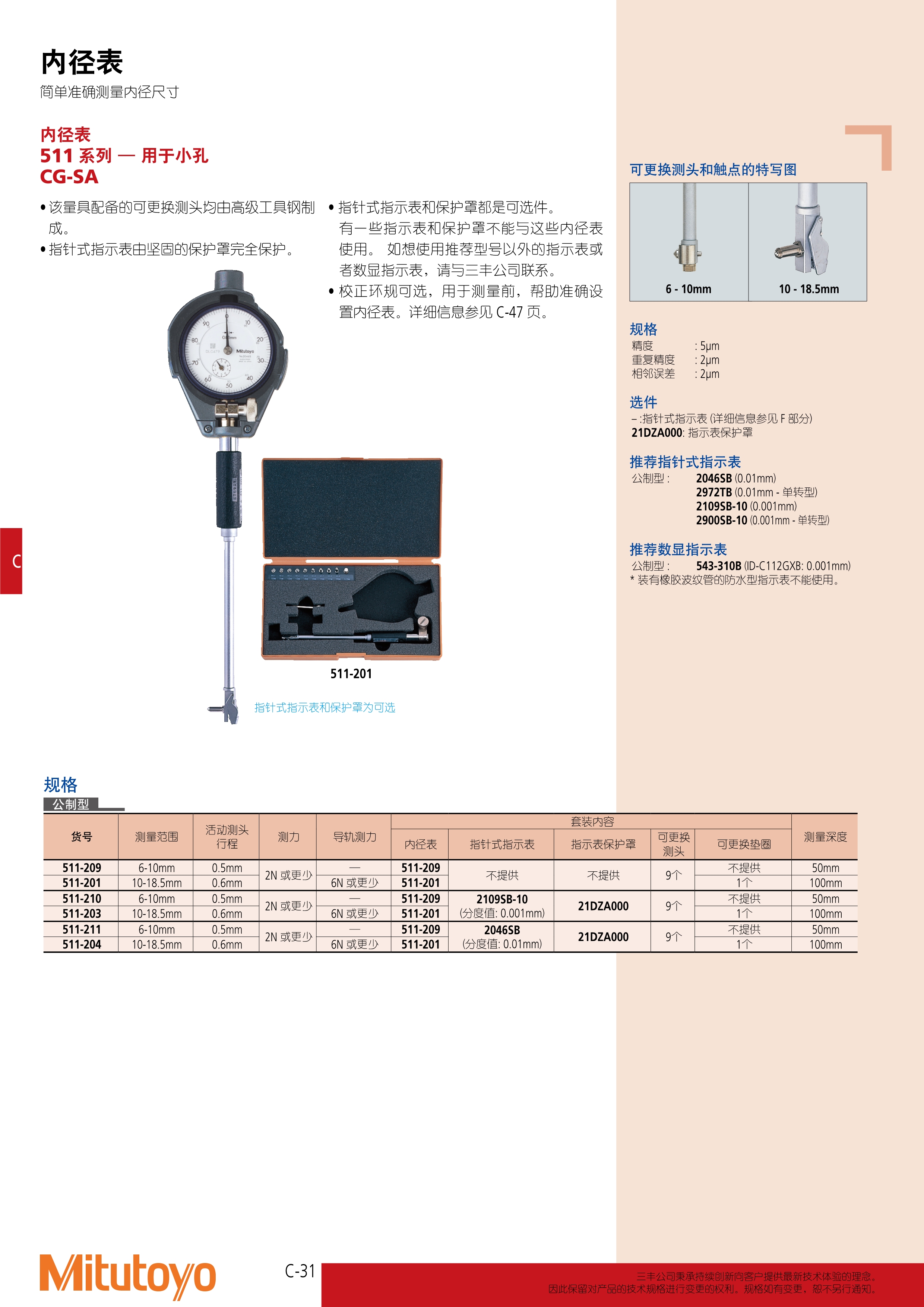简述: 内径表 511 系列 — 用于小孔 CG-SA • 该量具配备的可更换测头均由高级工具钢制 成。 • 指针式指示表由坚固的保护罩完全保护 • 指针式指示表和保护罩都是可选件。 有一些指示表和保护罩不能与这些内径表 使用。 如想使用推荐型号以外的指示表或 者数显指示表,请与三丰公司联系。 • 校正环规可选,用于测量前,帮助准确设 置内径表。详细信息参见 C-47 页。