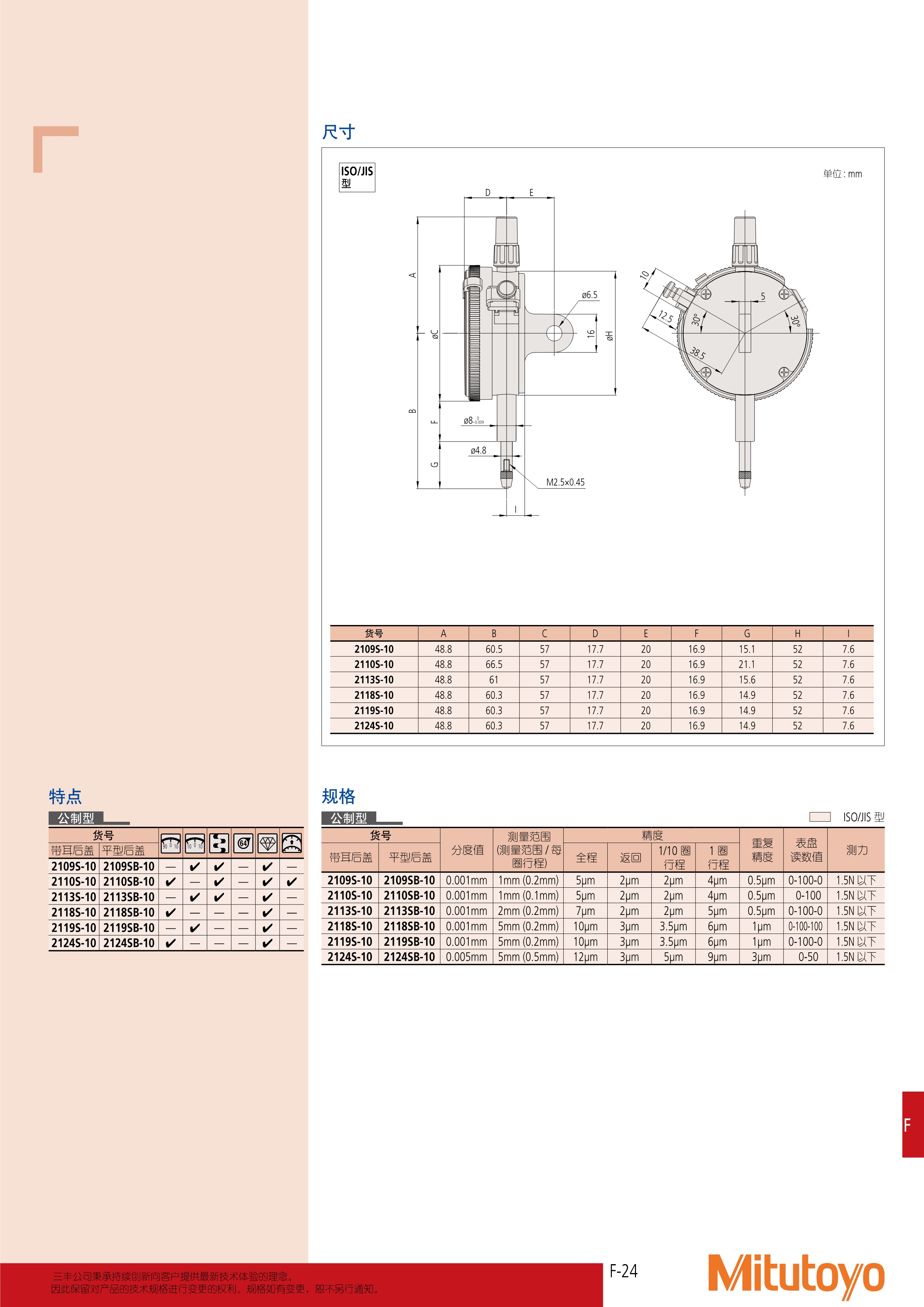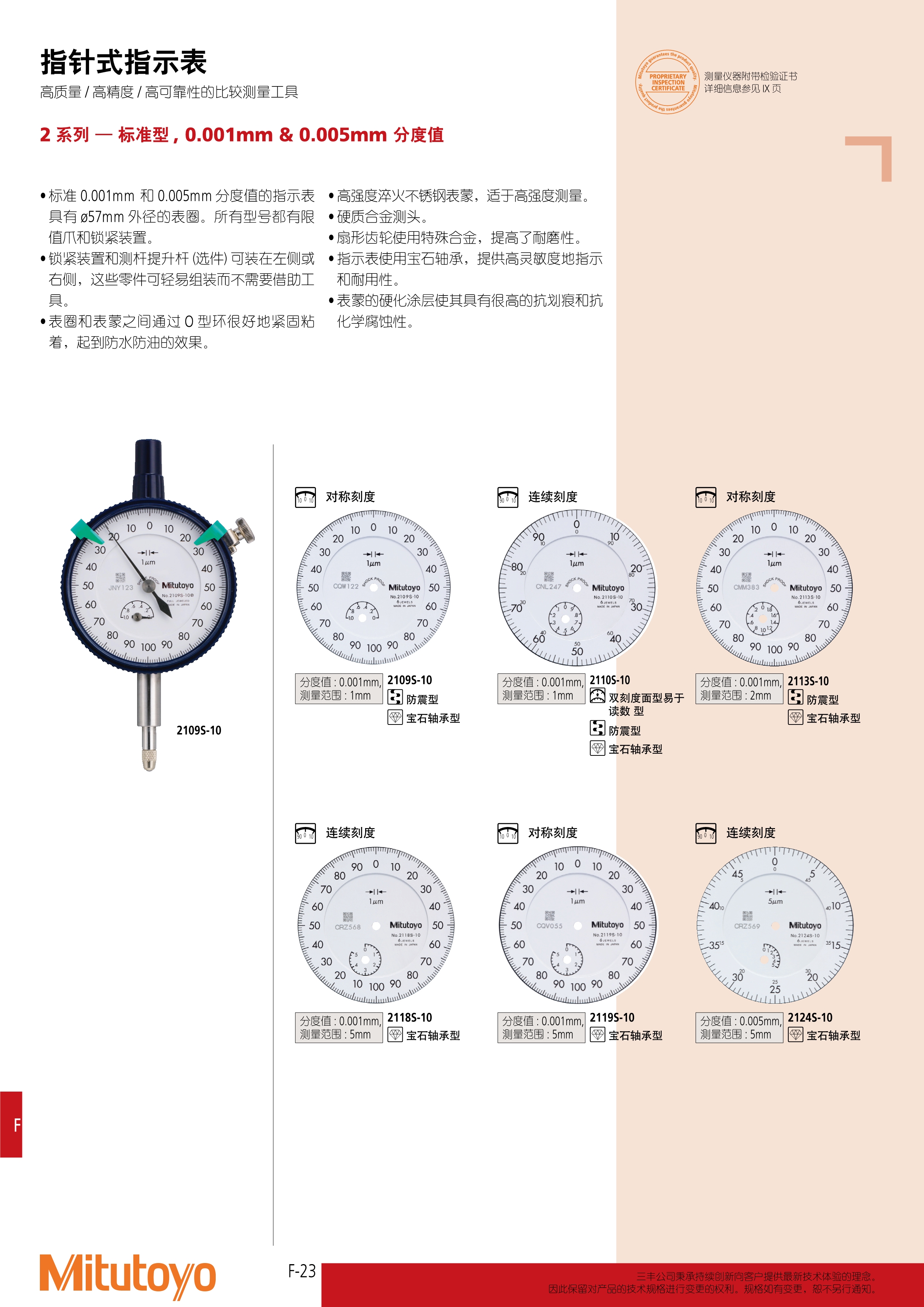 简述: 2 系列 — 标准型 , 0.001mm & 0.005mm 分度值 • 标准 0.001mm 和 0.005mm 分度值的指示表 具有 ø57mm 外径的表圈。所有型号都有限 值爪和锁紧装置。 • 锁紧装置和测杆提升杆 (选件) 可装在左侧或 右侧,这些零件可轻易组装而不需要借助工 具。 • 表圈和表蒙之间通过 O 型环很好地紧固粘 着,起到防水防油的效果