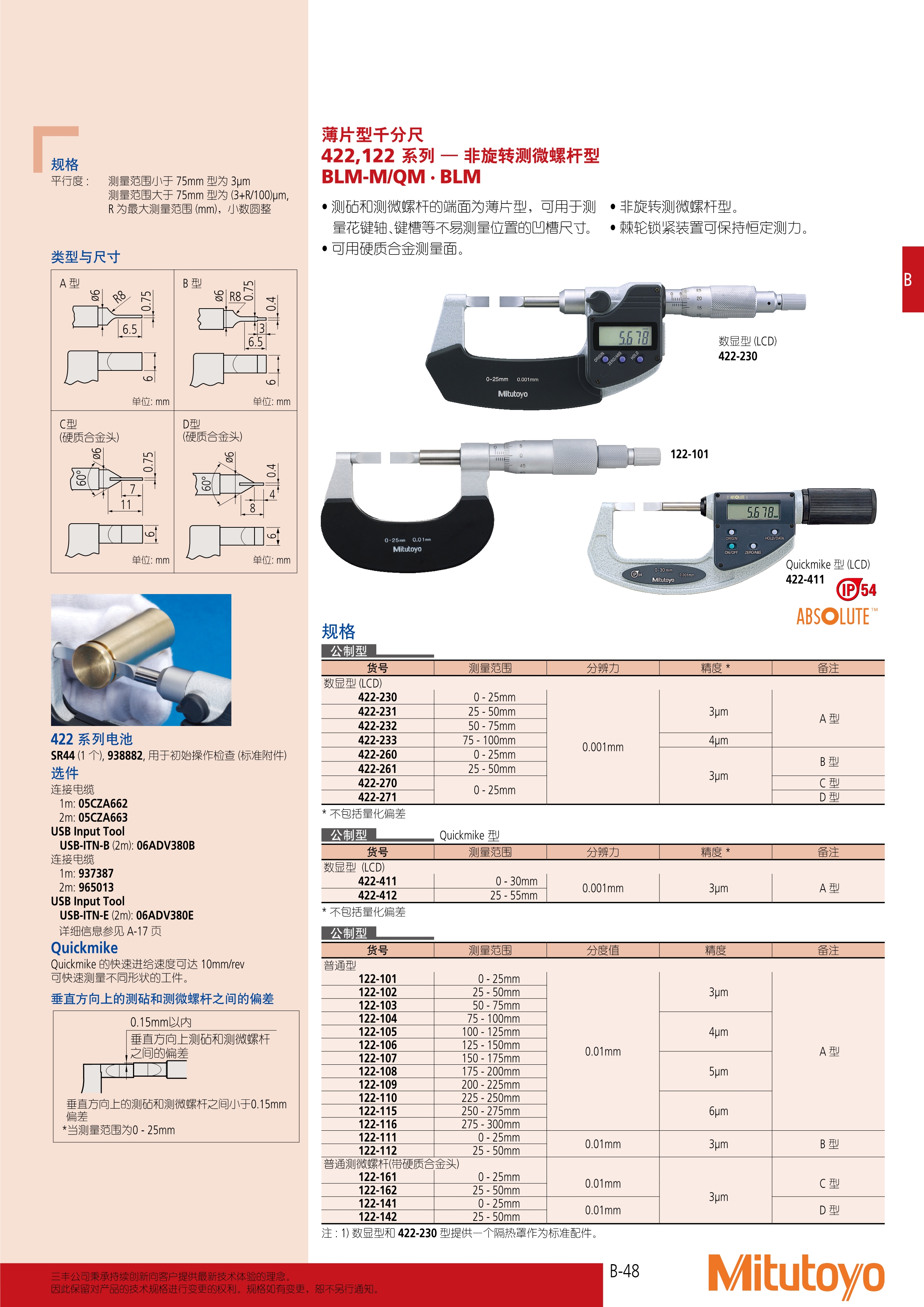 简述: 薄片型千分尺 422,122 系列 — 非旋转测微螺杆型 BLM-M/QM · BLM • 测砧和测微螺杆的端面为薄片型,可用于测 量花键轴、键槽等不易测量位置的凹槽尺寸。 • 可用硬质合金测量面。 • 非旋转测微螺杆型。 • 棘轮锁紧装置可保持恒定测力。