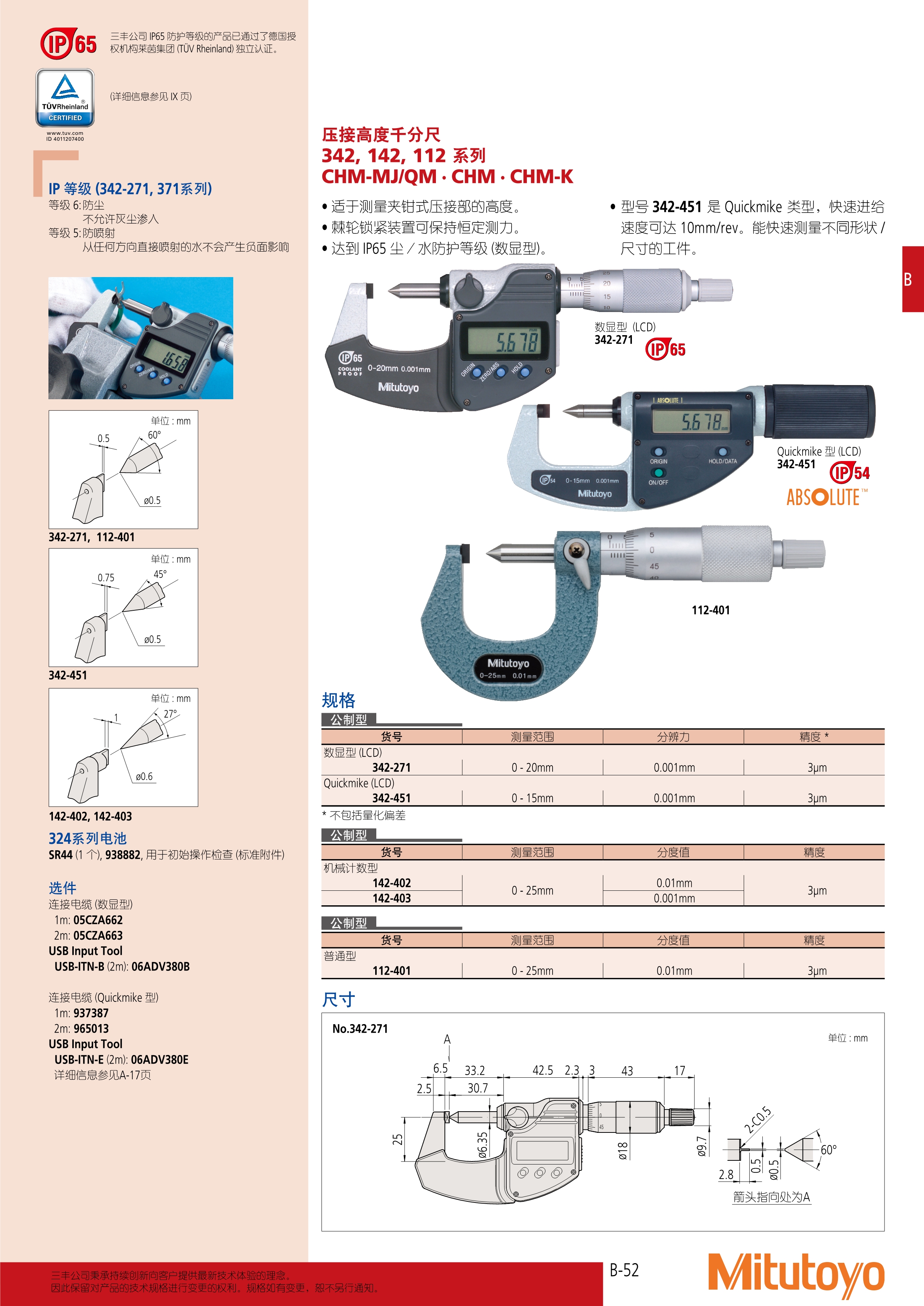 简述: 压接高度千分尺 342, 142, 112 系列 CHM-MJ/QM · CHM · CHM-K • 适于测量夹钳式压接部的高度。 • 棘轮锁紧装置可保持恒定测力。 • 达到 IP65 尘/水防护等级 (数显型)