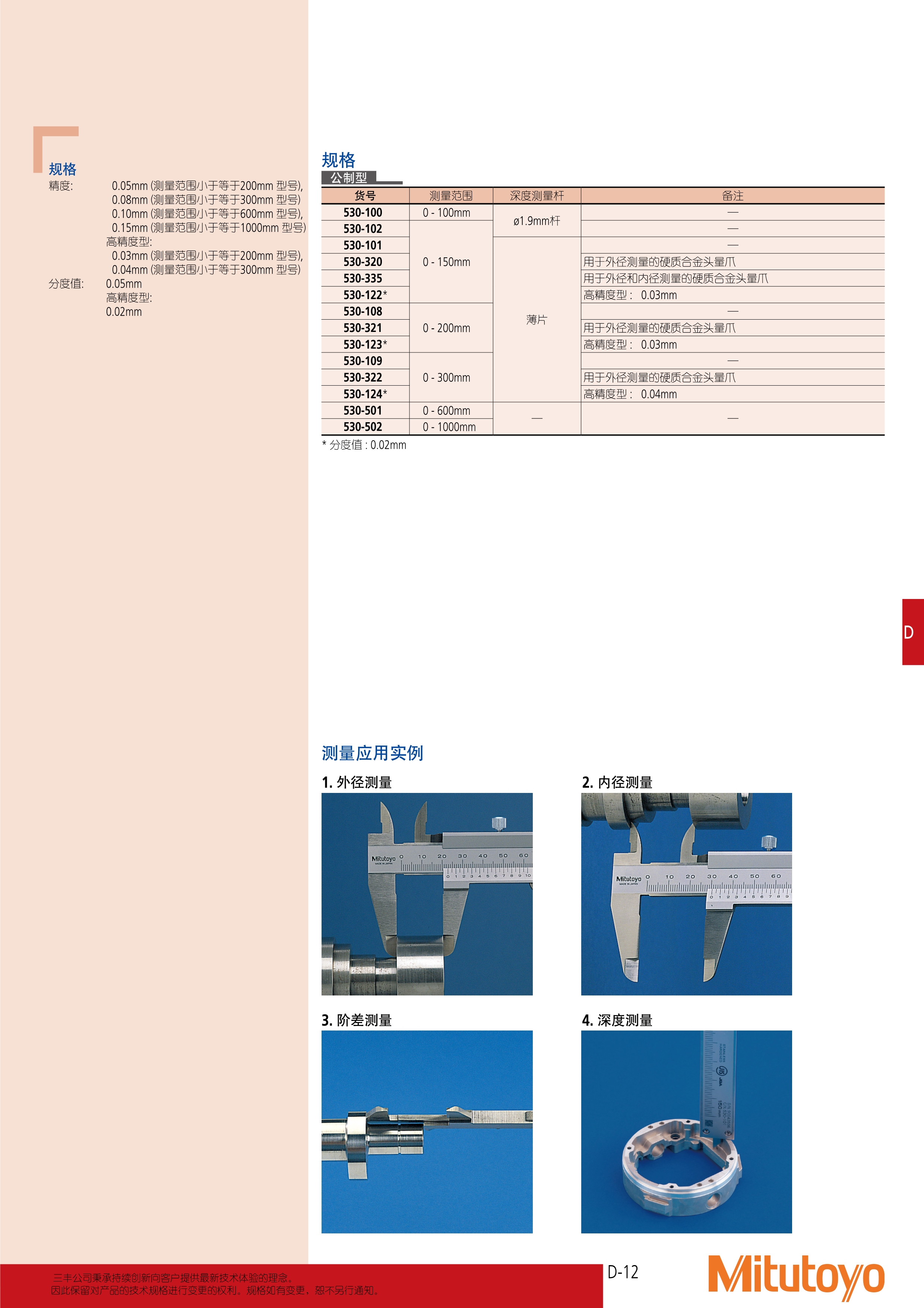 简述: 游标卡尺 530 系列 — 标准型 N · N-W • 简洁、基本的设计。 • 阶梯式刻度面板能防止灰尘侵入主标尺和 游标尺之间。 • 较小的游标面角度 (14˚)、便于读数。 • 可测量外径、内径、深度和阶差。 • 带有硬质合金量爪的卡尺是测量粗加工产 品,铸造件及研磨石等的最佳选择。
