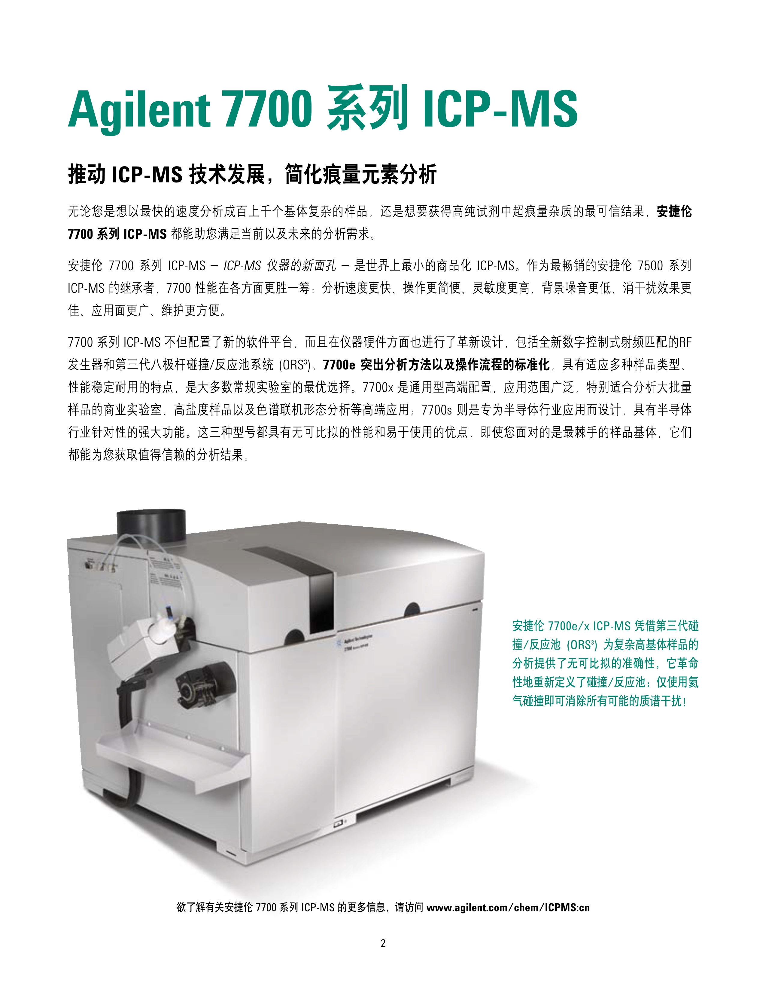 简述: 无论您是想以最快的速度分析成百上千个基体复杂的样品,还是想要获得高纯试剂中超痕量杂质的最可信结果,安捷伦 7700 系列 ICP-MS 都能助您满足当前以及未来的分析需求。 安捷伦 7700 系列 ICP-MS – ICP-MS 仪器的新面孔 – 是世界上最小的商品化 ICP-MS。作为最畅销的安捷伦 7500 系列 ICP-MS 的继承者,7700 性能在各方面更胜一筹:分析速度更快、操作更简便、灵敏度更高、背景噪音更低、消干扰效果更 佳、应用面更广、维护更方便。