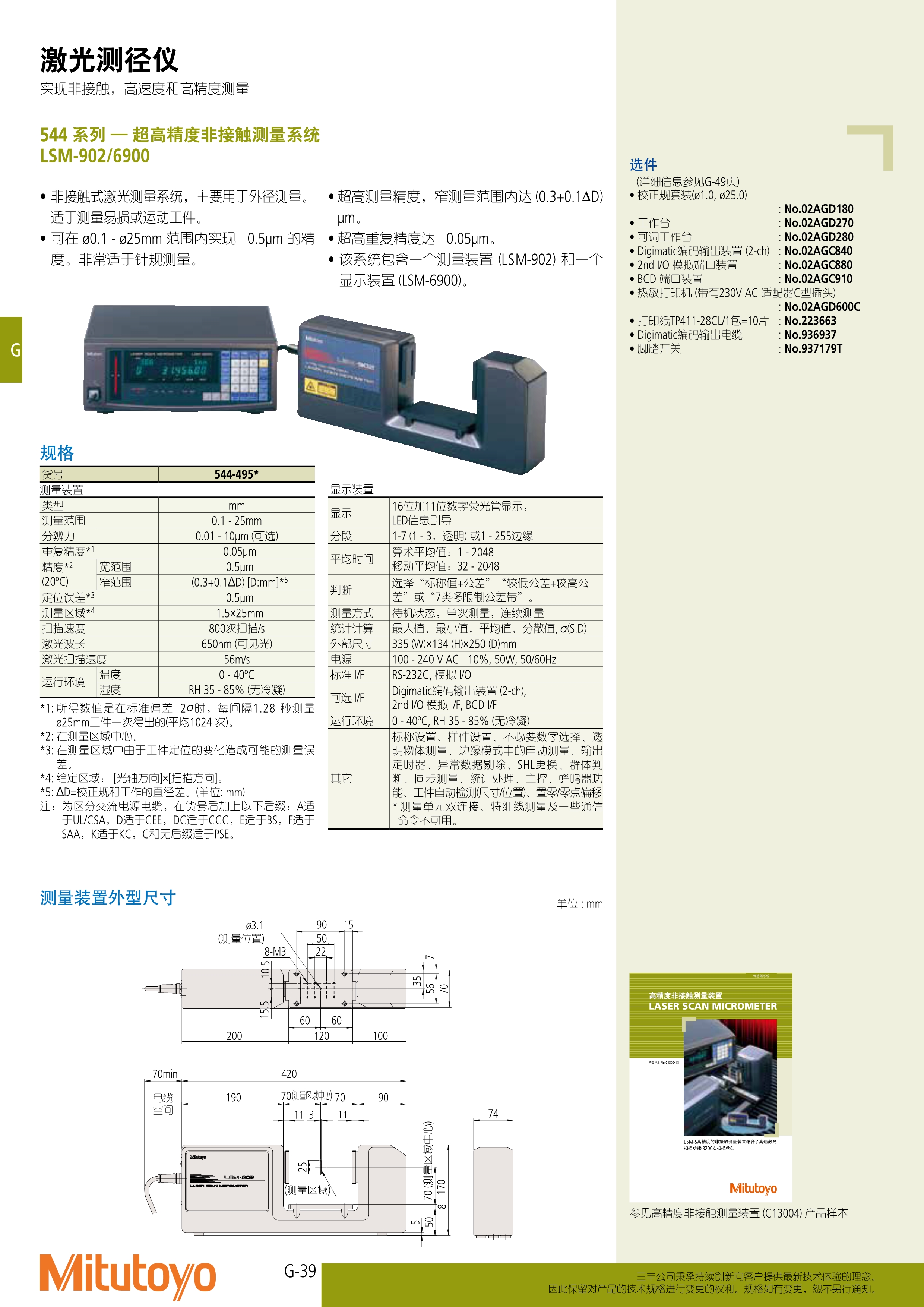 简述: • 非接触式激光测量系统,主要用于外径测量。 适于测量易损或运动工件。 • 可在 ø0.1 - ø25mm 范围内实现 ±0.5µm 的精 度。非常适于针规测量。 • 超高测量精度,窄测量范围内达 (0.3+0.1∆D) µm。 • 超高重复精度达 ±0.05µm。 • 该系统包含一个测量装置 (LSM-902) 和一个 显示装置 (LSM-6900)。