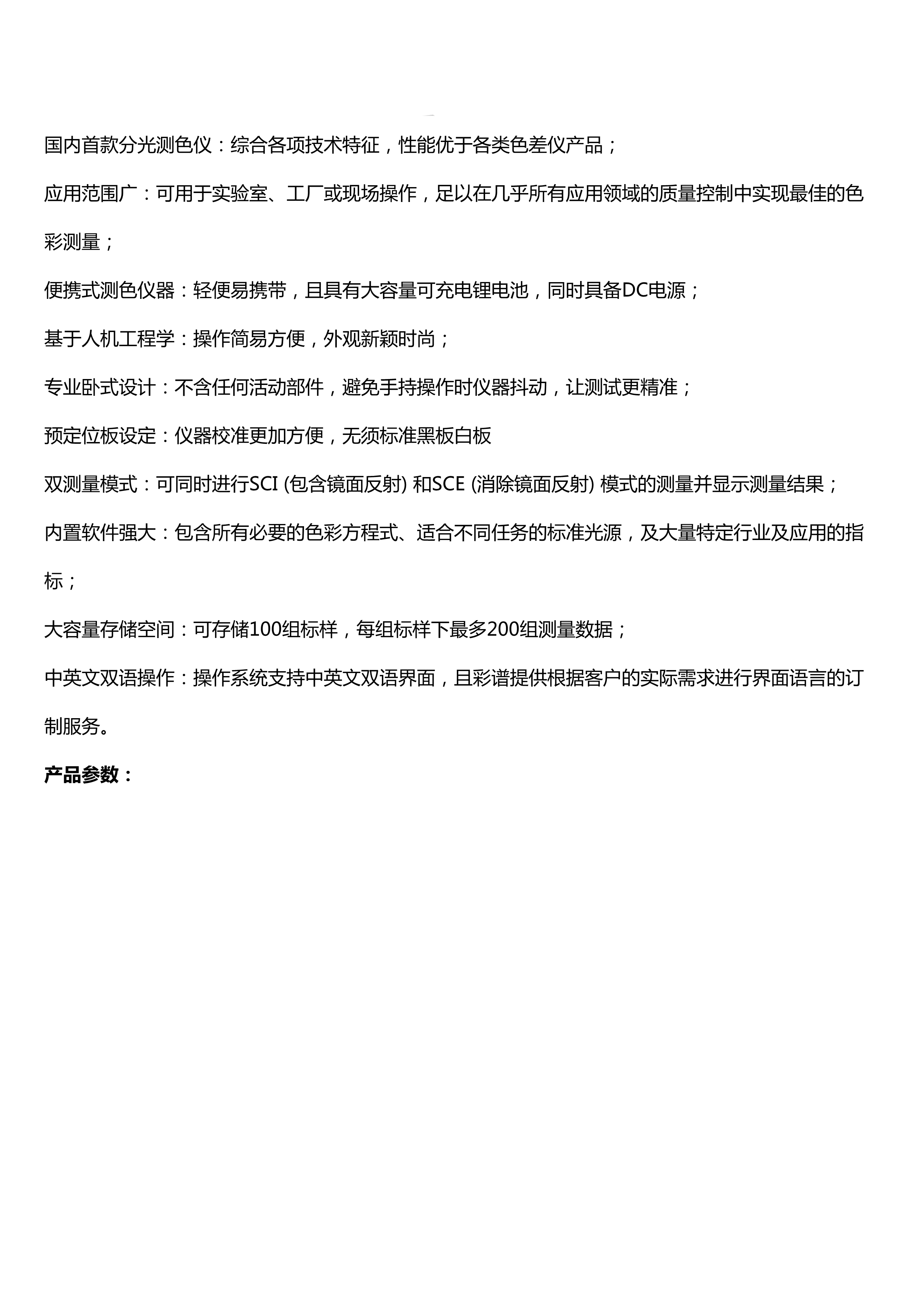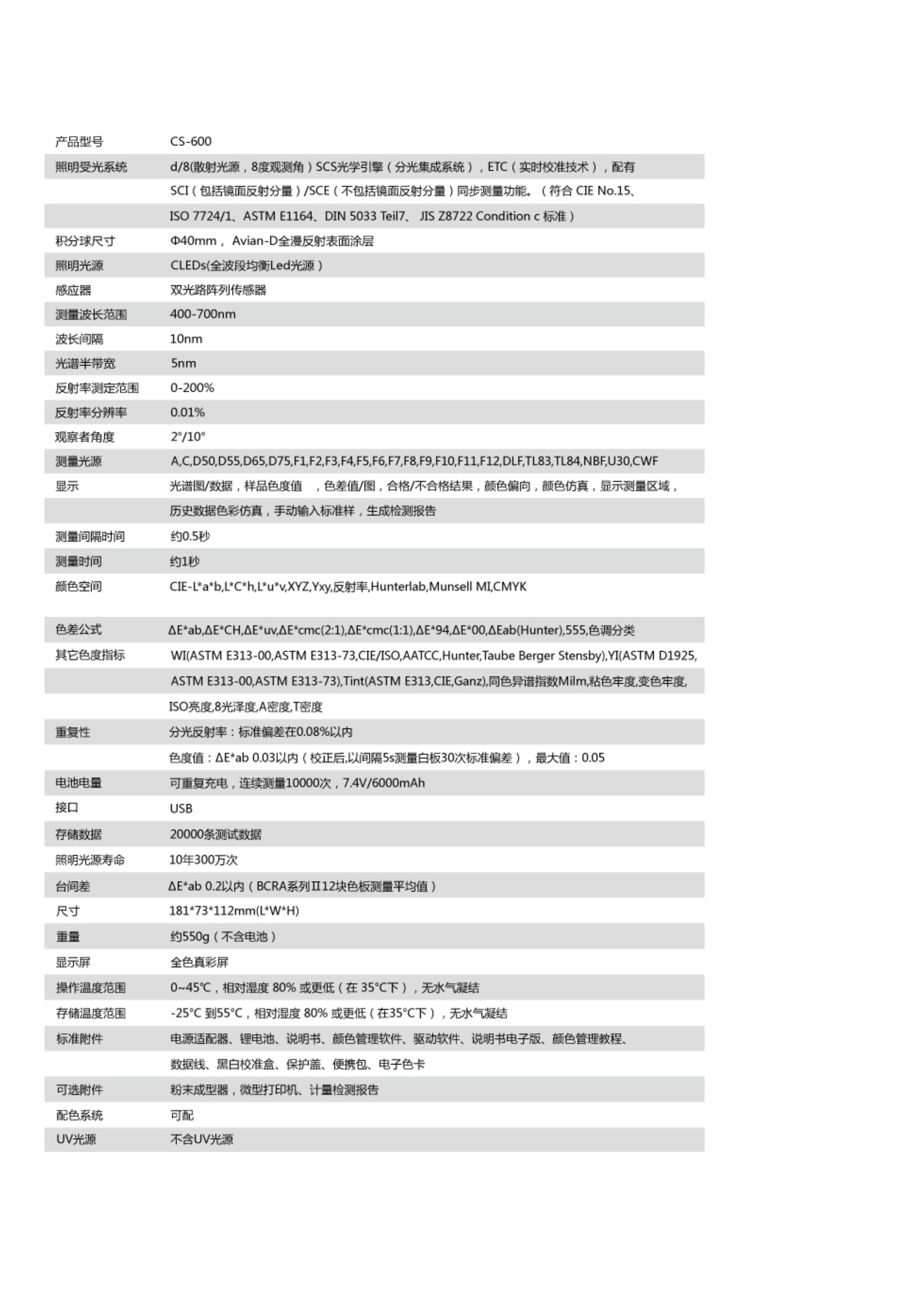 简述: CS-600是国内首款分光测色仪,获得国家一级计量认证,综合多项技术特征,具有性能优越、在国内外同类产品中性价比高的特点。性能远远优于传统色差仪产品。且应用广泛,可在工厂、实验室现场操作,足以在几乎所有应用领域的质量控制中实现最佳的色彩测量。