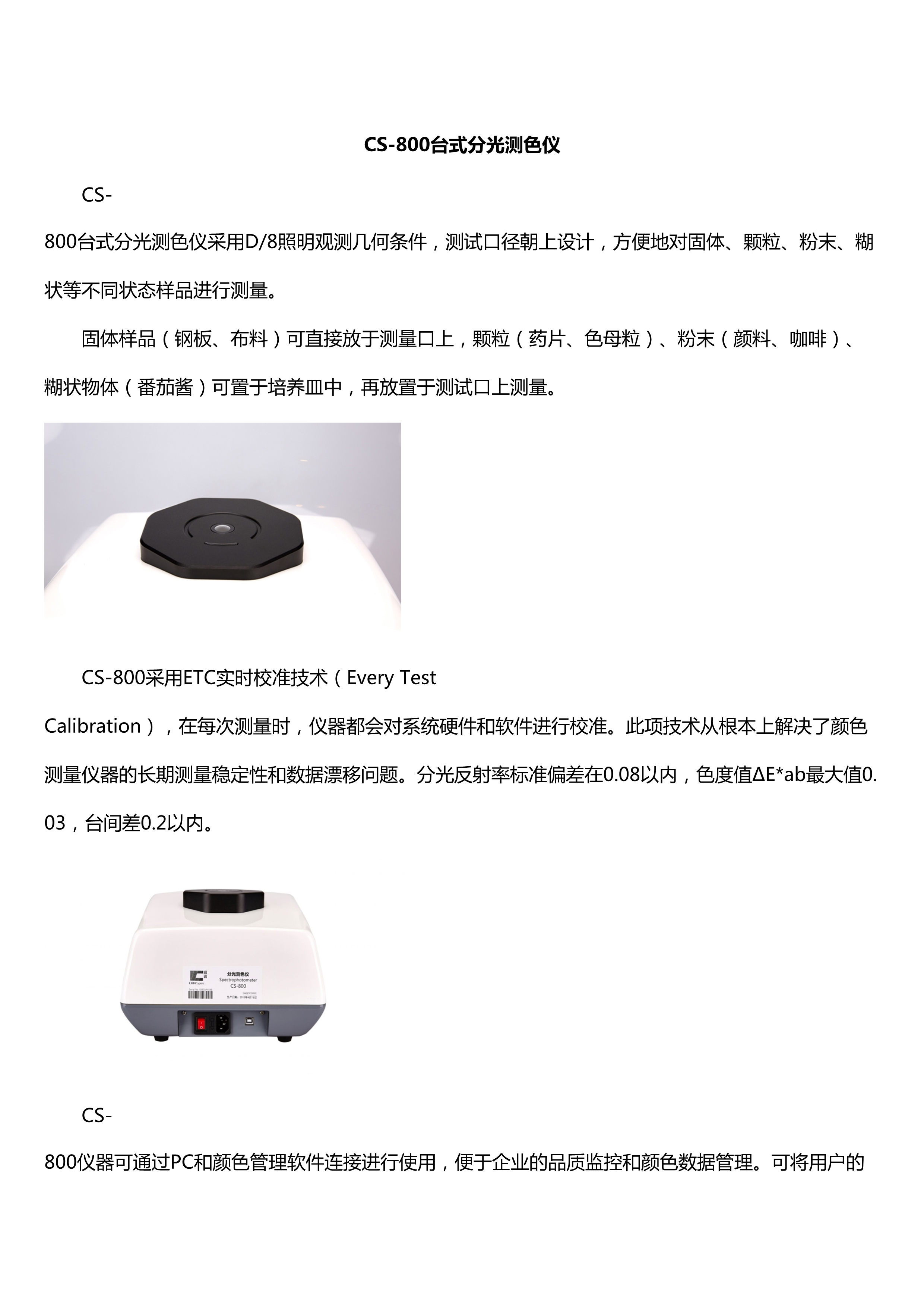 简述: CS-800台式分光测色仪采用D/8照明观测几何条件,测试口径朝上设计,方便地对固体、颗粒、粉末、糊状等不同状态样品进行测量。 固体样品(钢板、布料)可直接放于测量口上,颗粒(药片、色母粒)、粉末(颜料、咖啡)、糊状物体(番茄酱)可置于培养皿中,再放置于测试口上测量。