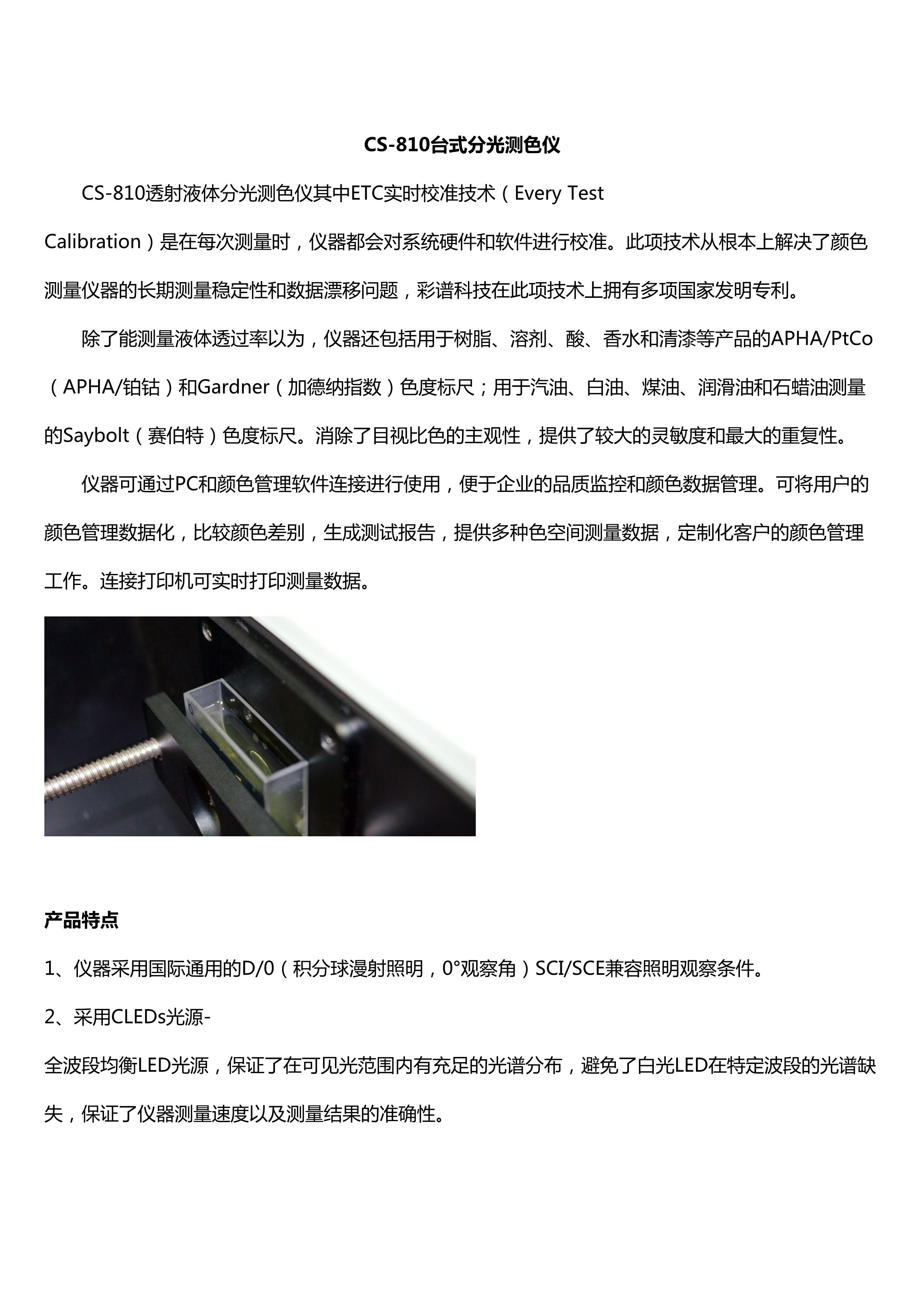 简述: CS-810透射液体分光测色仪其中ETC实时校准技术(Every Test Calibration)是在每次测量时,仪器都会对系统硬件和软件进行校准。此项技术从根本上解决了颜色测量仪器的长期测量稳定性和数据漂移问题,彩谱科技在此项技术上拥有多项国家发明专利。
