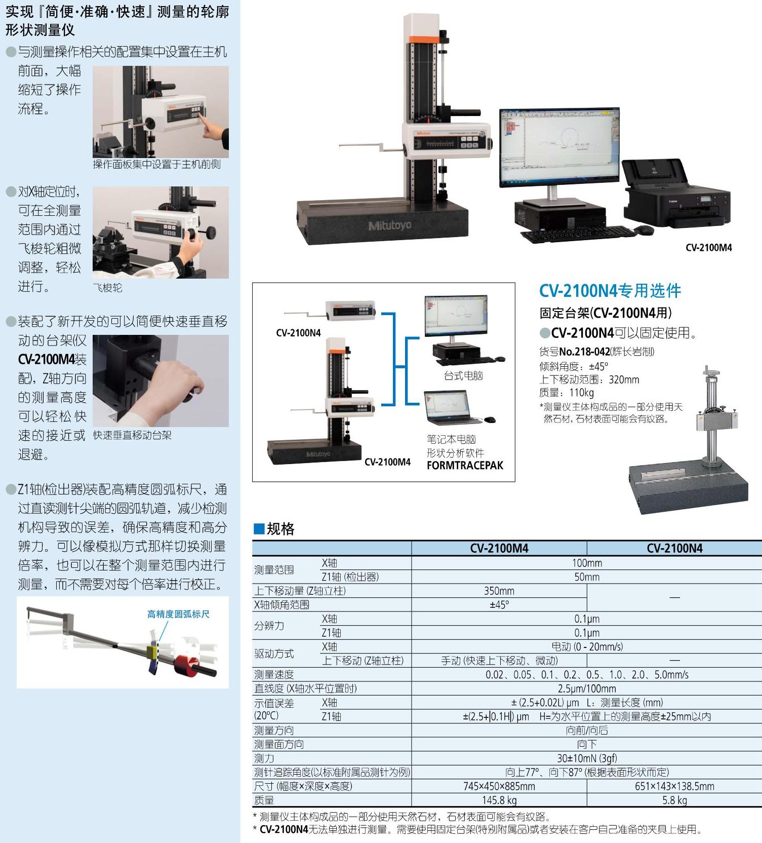 简述: CV-2100轮廓测量仪是实现『简便· 准确· 快速』测量的轮廓形状测量仪。 ● 与测量操作相关的配置集中设置在主机前面,大幅缩短了操作流程。 ● 装配了新开发的可以简便快速垂直移动的台架(仅CV-2100M4装配),Z轴方向的测量高度可以轻松快速的接近或退避。 ● Z1轴(检出器)装配高精度圆弧标尺,通过直读测针尖端的圆弧轨道,减少检测机构导致的误差,确保高精度和高分辨力。可以像模拟方式那样切换测量倍率,也可以在整个测量范围内进行测量,而不需要对每个倍率进行校正。